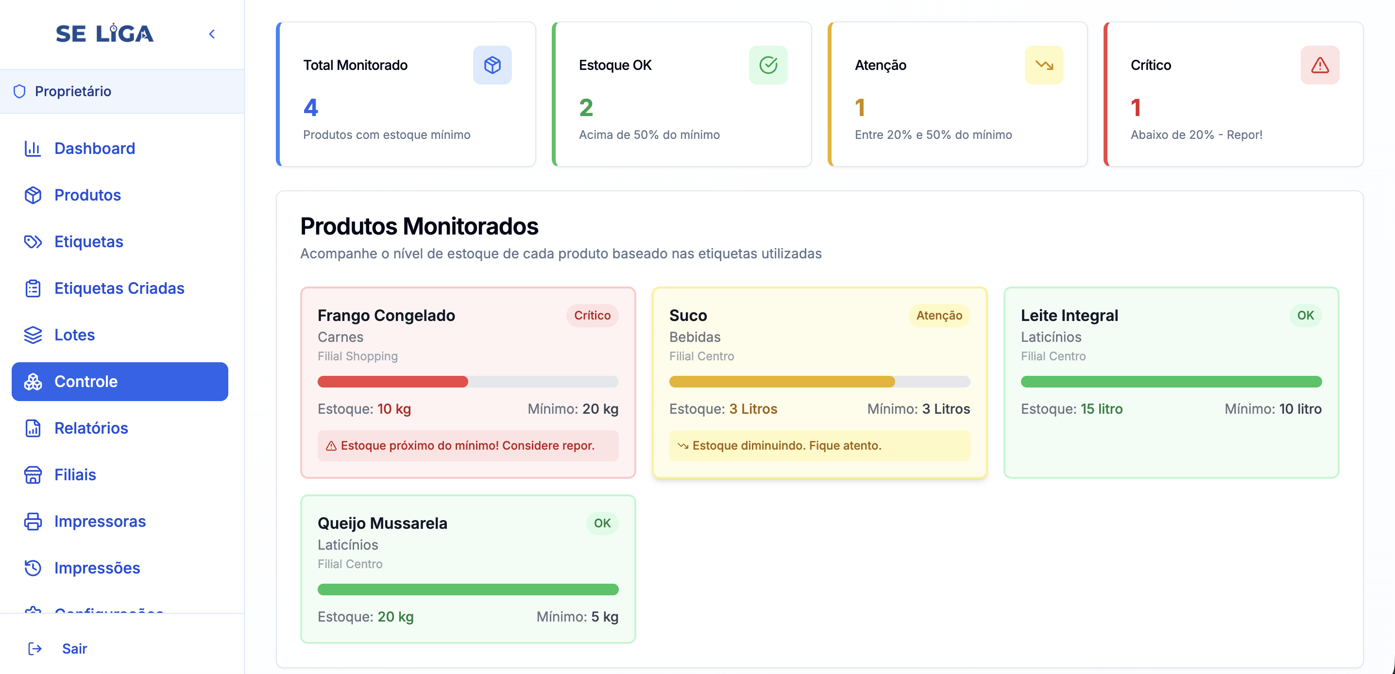Veja produtos usados, alertas e movimentações em tempo real no painel.